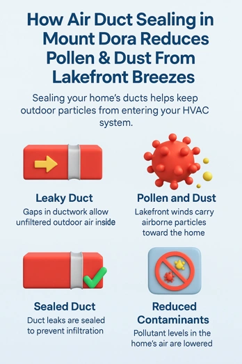 Living along Mount Dora’s lakes, we’ve seen a consistent pattern inside nearby homes: the same breezes that cool the water also drive pollen and fine dust into duct systems through hidden leaks most homeowners never see. In our hands-on evaluations of local HVAC systems, we’ve found that unsealed duct connections often act like vacuum lines, pulling in outdoor contaminants from attics, crawl spaces, and wall cavities—then redistributing them throughout the house. This page breaks down how targeted air duct sealing in Mount Dora directly interrupts that pathway, reducing pollen and dust from lakefront airflow, improving day-to-day air quality, and helping your HVAC system deliver cleaner air where your family actually breathes.
